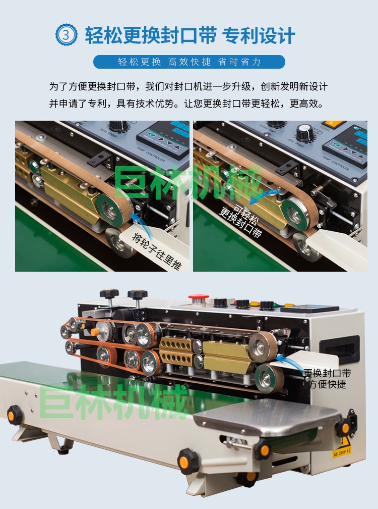 本機是新一代集印碼,封口,連續(xù)輸送為一體的自動薄膜封口機,具有印字清晰、顔色可選、即印即干、換字方便等特點。