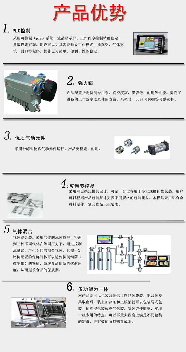 1. 本公司針對連鎖店、超市、專賣店、實(shí)驗(yàn)室、小型食品生產(chǎn)企業(yè)等推出的一款突破性設(shè)計真理氣調(diào)保鮮包裝機(jī)。