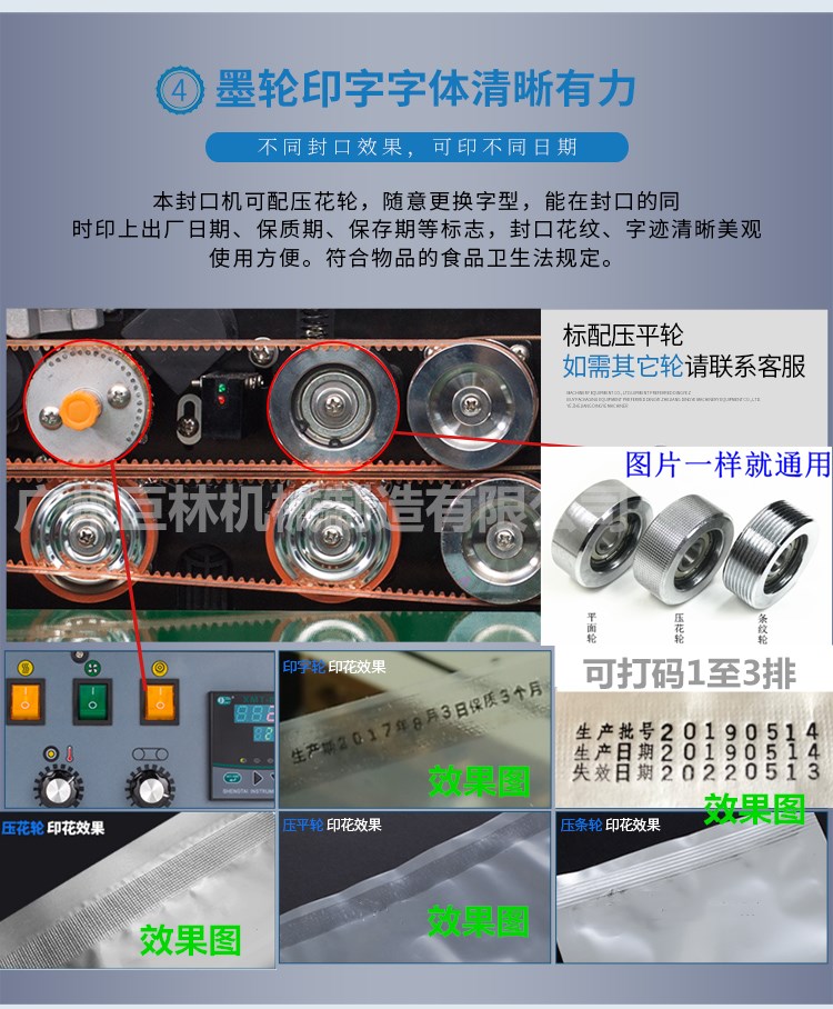 該機(jī)具有連續(xù)輸送、封口、油墨印制標(biāo)簽(出廠日期、生產(chǎn)批號等)一次完成之功效,可封合印制任何一種可熱性的薄膜。