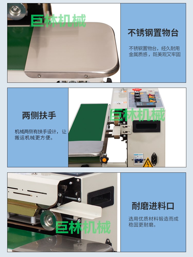 本機(jī)是新一代集印碼,封口,連續(xù)輸送為一體的自動薄膜封口機(jī),具有印字清晰、顔色可選、即印即干、換字方便等特點。