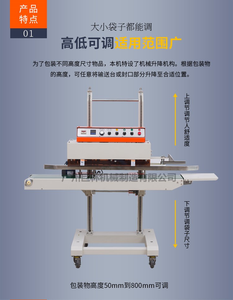 本機(jī)適用于任何以熱封材料的封口。速度無(wú)級(jí)可調(diào),恒溫控制,溫度可調(diào),輸送臺(tái)高低可調(diào),適應(yīng)范圍極廣泛。
